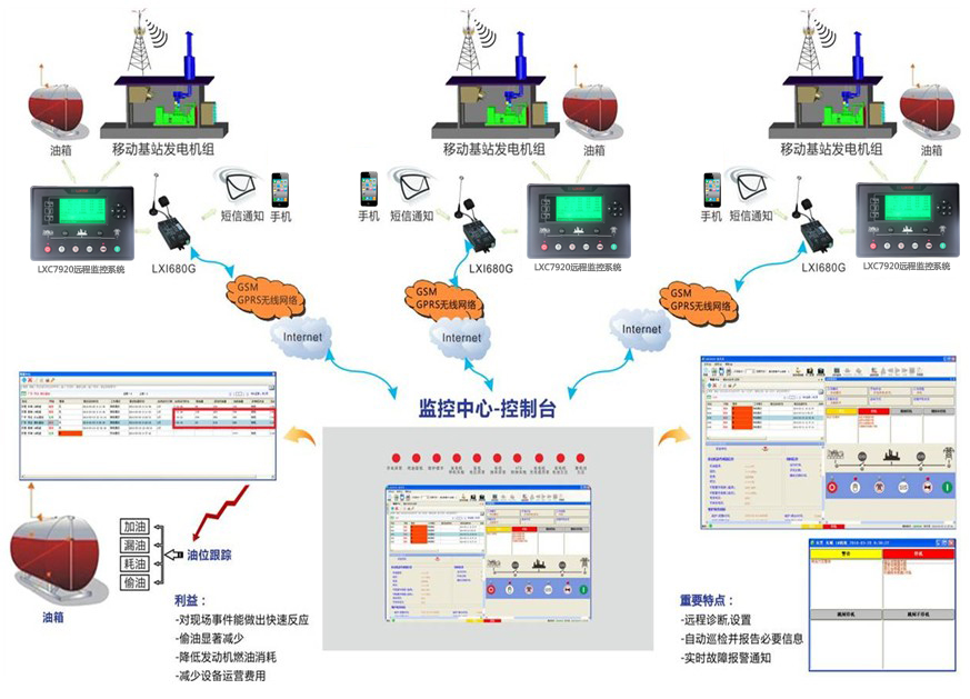 在办公室打开软件,查看发电机组工作参数。同时可通过手机GPRS网络接受机组报警信号。出现问题,控制器读出故障记录,派人过去简单维修调试就可以。减少维护操作成本,多台机组一人在PC端管理。通过PC软件输入采集器编号,采集发电机组工作各项参数,可同时通过网络发送工作参数至PC端和手机上,LIXISE自动化控制系统为无人值守成为了可能。让操作技术员远离柴油发电机组噪音、燥热的恶劣环境,实现远程监控,极大的方便了用户使用。